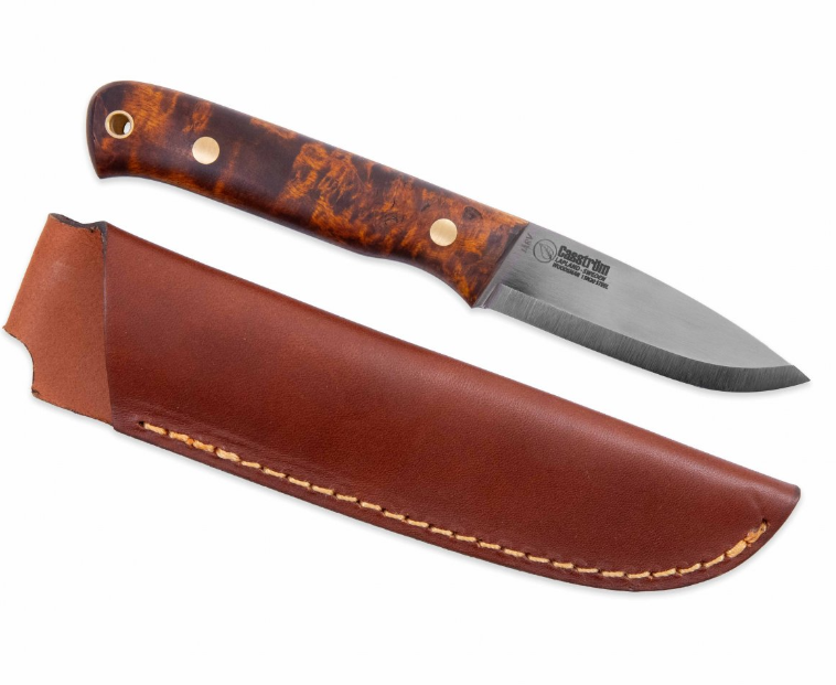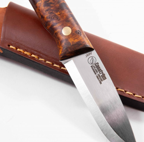 Casström Woodsman Järv kniv i mörk masurbjörk, slida i läder en tälj- och lägerkniv byggd för precision. Det tunnare kolstålsbladet gör den exceptionell för fjäderstickor, fällbygge, verktygstillverkning och lagerarbete. Förvildmarkens hantverkare.