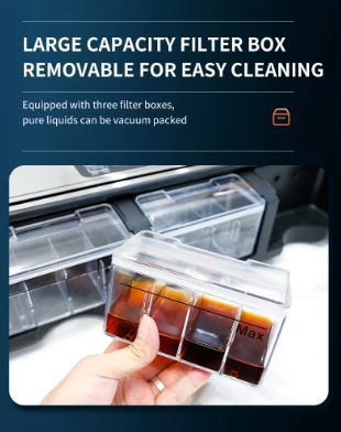The machine is equipped with three rear collection containers for liquids suctioned out during the packaging process, minimizing mess and enhancing the machine's functionality and user-friendliness. The containers are easy to empty.