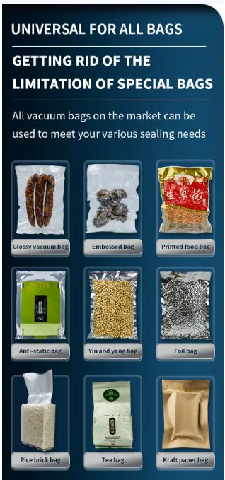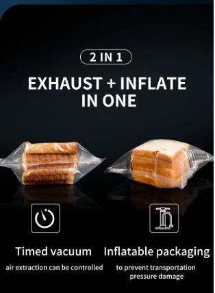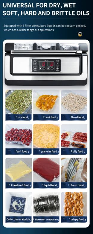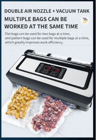 This machine can vacuum-seal all types of plastic bags and be used for various models of vacuum containers. It also includes a convenient inflation function, perfect for packaging sensitive foods.
