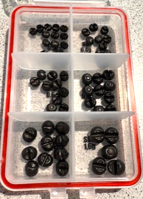 IFISH Kluvna hagel. Sortimentask med kluvna hagelsänken i olika storlekar. Innehåller 60st sänken mellan 0,3g och 1,6g. Blyfria