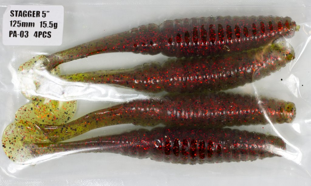 Stagger är en välkänd jigg som fiskar bra efter många arter. Denna är 5" 125mm, tillverkad av ECO-silicon som inte luktar, smaksatt med räka, fisk eller vitlök. Ett effektivt bete för stor abborre, Gös, Gädda, Öring och för kustfiske. Den rejäla stjärten ger den bra simrörelser, kroppens form förstärker ytterliga ett attraktivt och naturlit rörelsemönster. Finns i ett flertal färger med glitter för bästa resultat.