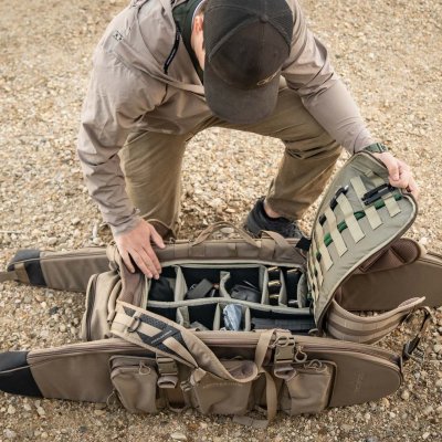 Eberlestocks UpRanger Pack är utformad med en polykarbonat sida för att du snabbt ska kunna lägga ner din väska på backen utan att behöva fundera på om underlaget är blött eller smutsigt. När du lagt ner din väska kommer du åt innehållet från ryggens sida där du kan avskilja innehållet med medföljande vadderade avskiljare. På båda sidor av säcken finns 3 mindre förvaringsfack som sitter ihop och kan tas bort om man önskar lika så midjebältet är avtagbart. På säckens undersida finns fack för att förvara regnskydd. MOLLE-system både inuti väskan samt utanpå så att du tillexempel kan fästa på vapenfodral enkelt.